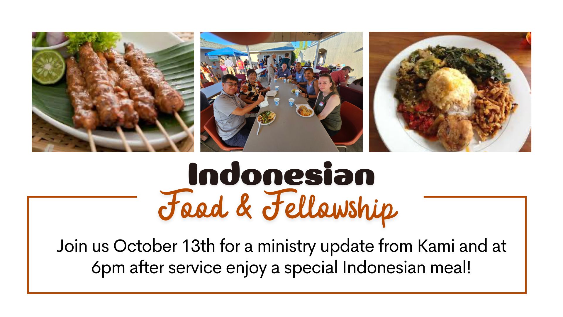 Stick around after service to enjoy a special tasty Indonesian meal on behalf of the hospitality of Kami. This is a wonderful opportunity to share a meal, strengthen our community, and connect with fellow members over delicious food!